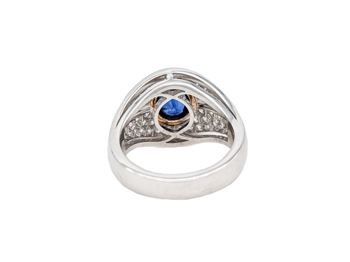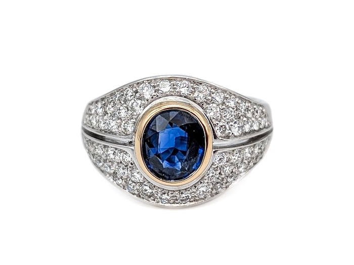 Au centre, un superbe saphir facetté d’un poids estimé à 1,26 carat est mis en valeur par un serti clos en or jaune, apportant chaleur et intensité à la pierre. Ce contraste subtil entre l’or jaune et l’or blanc souligne la profondeur du saphir et lui confère une présence remarquable.