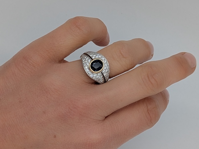 Les diamants taille brillant, au nombre de 64 pour un poids total d’environ 0,85 carat, présentent un éclat vif et scintillant. Leur taille moderne optimise la dispersion de la lumière, créant un contraste lumineux remarquable avec le saphir. Cette association classique en gemmologie met en valeur la profondeur du bleu et la brillance des diamants.