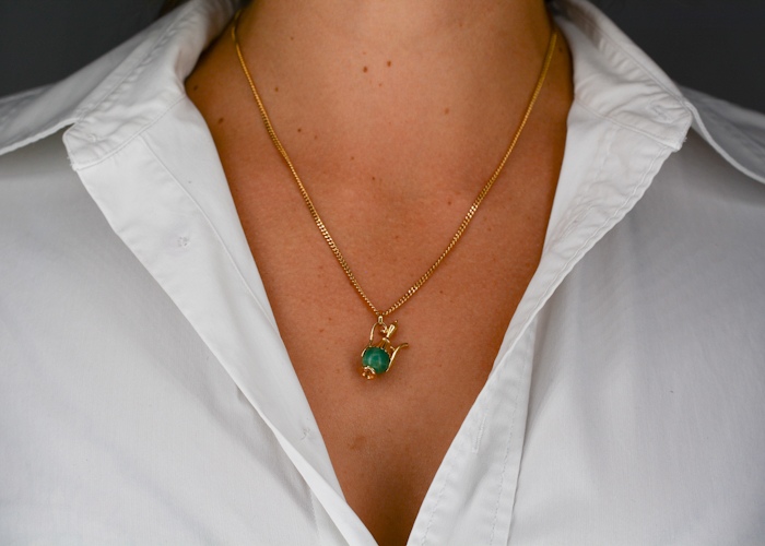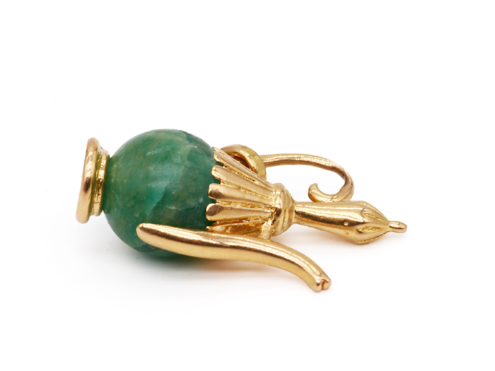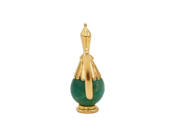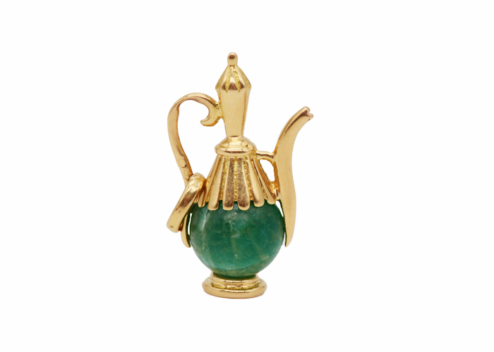 La cafetière est minutieusement détaillée avec une petite pierre en jade vert, symbole de sagesse et de paix, et des ornements dorés délicatement ciselés sur la poignée et le haut de cette dernière. Ajoutez une touche de distinction à votre bracelet ou collier avec ce charm unique en son genre. D’une pureté inégalée, cette breloque est un hommage à l’opulence et à la finesse de la haute joaillerie ancienne.