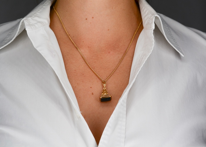 Ravissant pendentif Sceau Ancien. Ce charm en or jaune 18 carats est une véritable œuvre d’art, fusionnant habilement l’élégance intemporelle de l’or avec la beauté éblouissante de l’obsidienne.